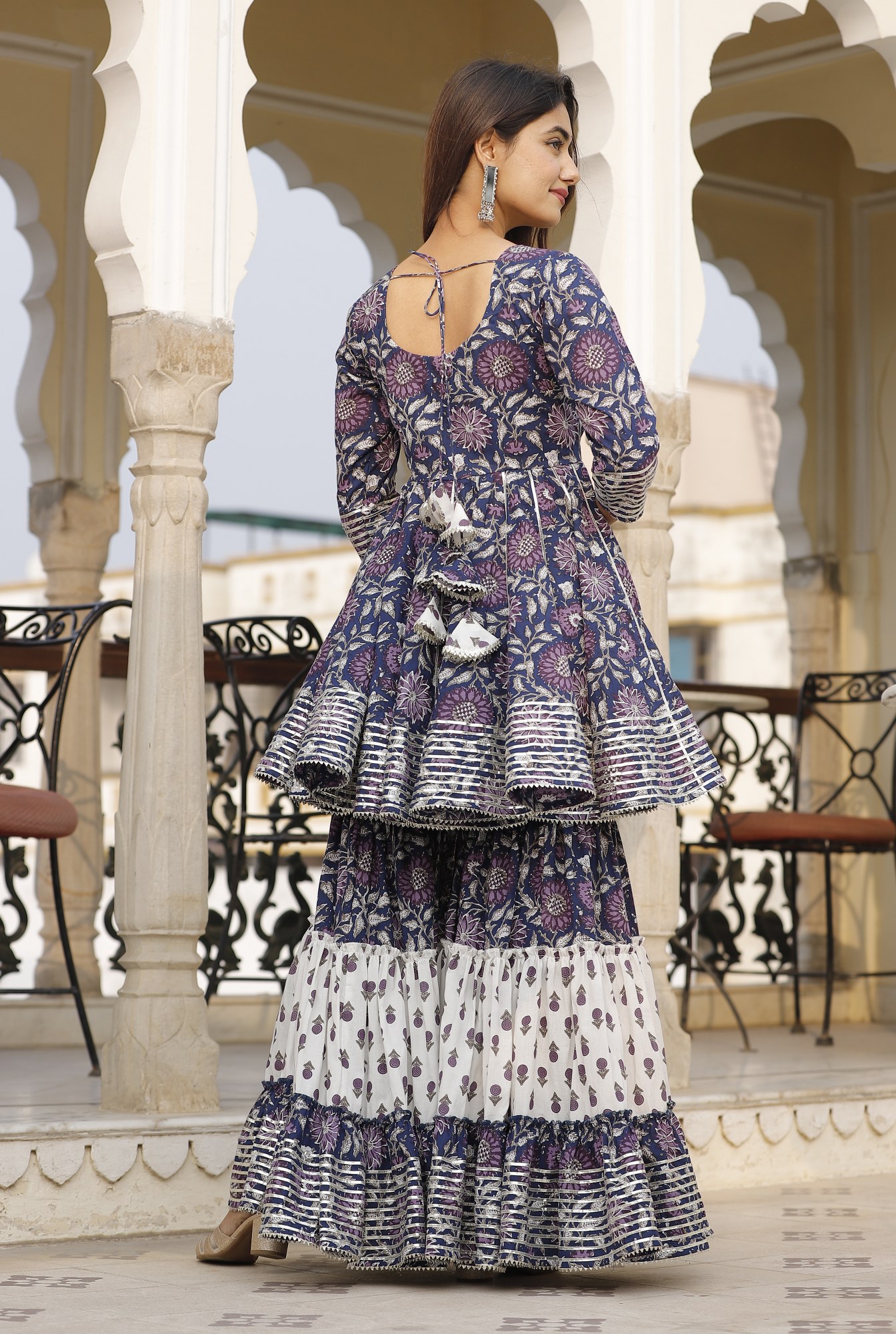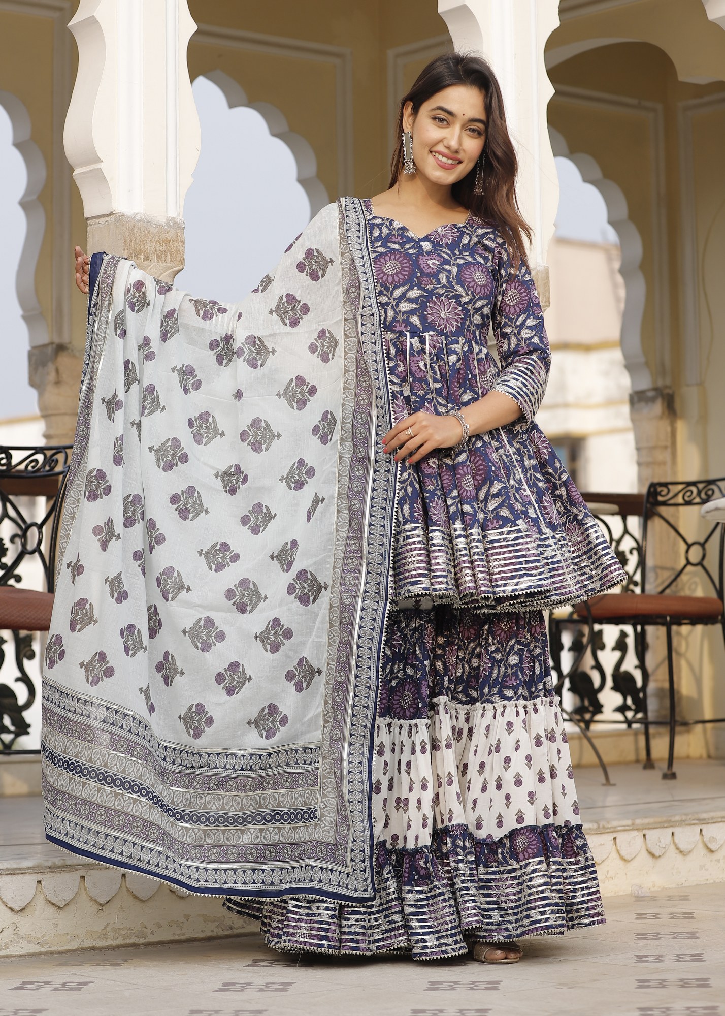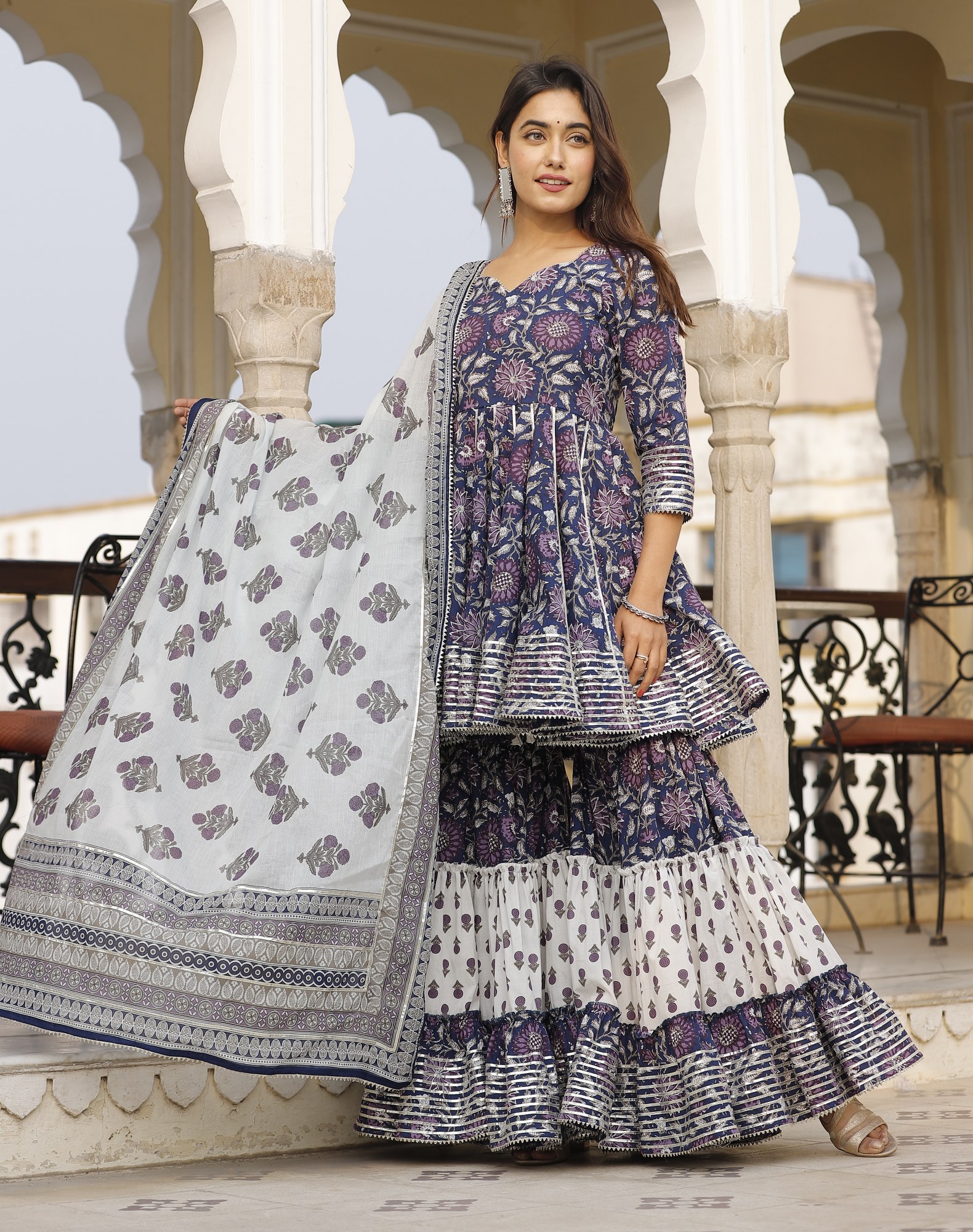 Introducing the Blue Daisy Sharara Set, featuring a beautiful flower print on a soft cotton fabric. The sharara pattern adds a touch of elegance, while the 3/4th sleeves and sweetheart neckline make it perfect for any occasion. The screen print technique ensures that the colors stay vibrant wash after wash. Available in all sizes, this set is sure to flatter any figure. Add a touch of elegance to your wardrobe with the Blue Daisy Sharara Set. This set is perfect for any season and any occasion, whether you’re dressing up for a special event or keeping it casual for everyday wear. The blue daisy print is fresh and vibrant, evoking feelings of spring and summer. The cotton fabric is soft and breathable, ensuring all-day comfort. The sharara pattern adds a unique touch, with its flowing pants that are sure to make you stand out in a crowd.