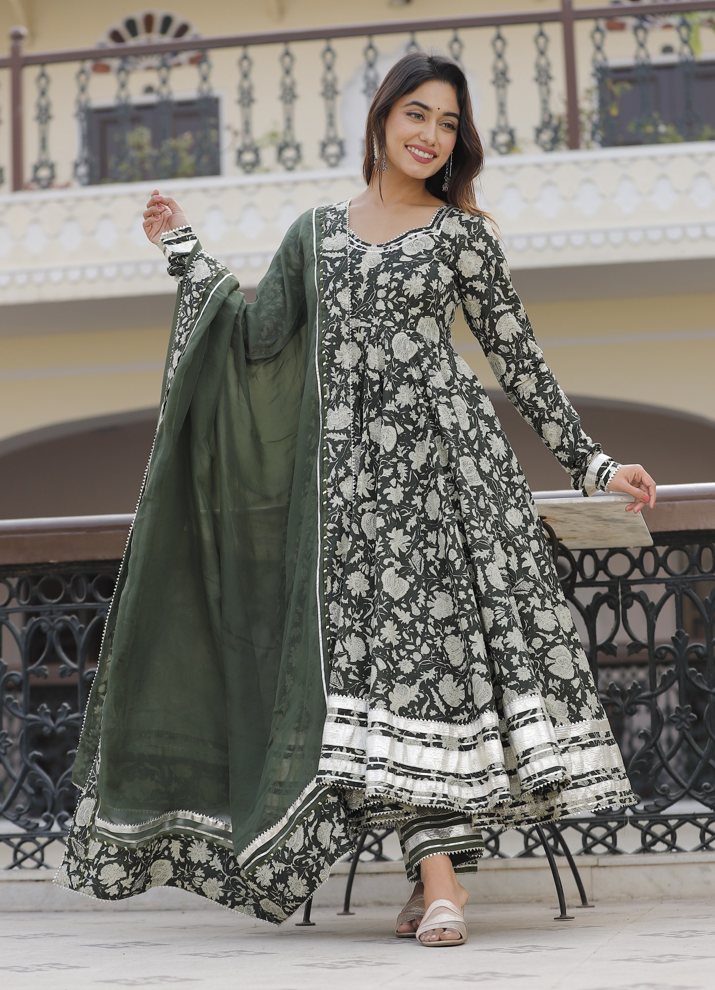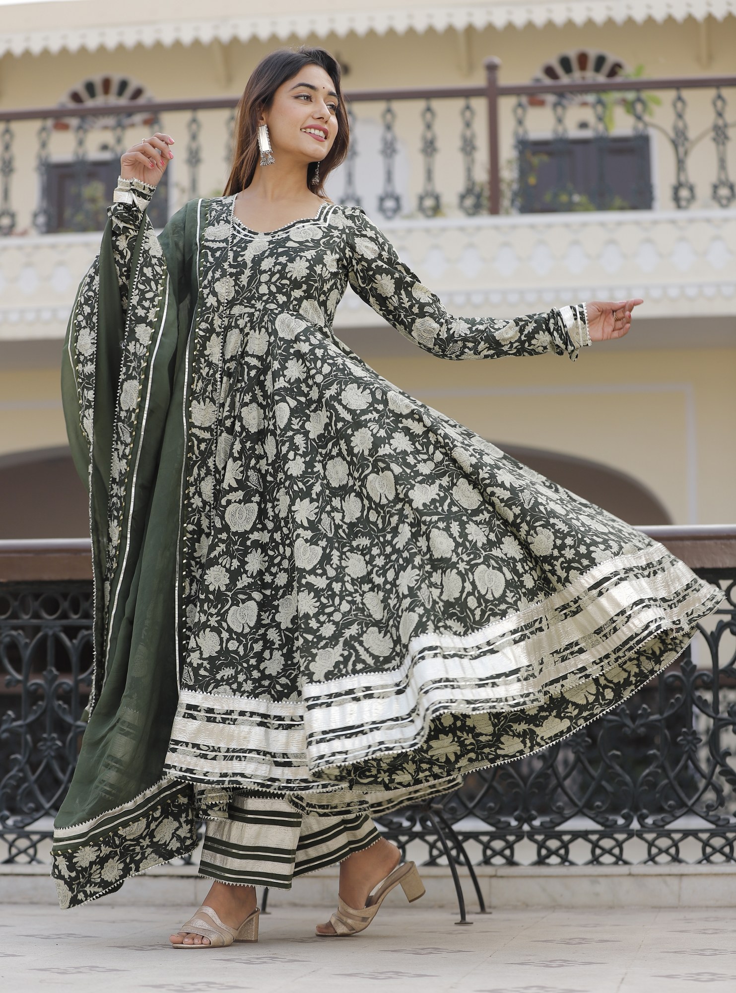 Introducing our Blue Green Anarkali Set, a stunning combination of colors that will add a unique touch to your wardrobe. The green color is fresh and lively, making it perfect for any occasion. Made from soft and breathable cotton fabric, this Anarkali set will keep you comfortable all day long. The Anarkali pattern is a classic design that has stood the test of time and is sure to never go out of style. The sleeveless and sweetheart neckline design is both feminine and modern, making this set suitable for women of all ages.
