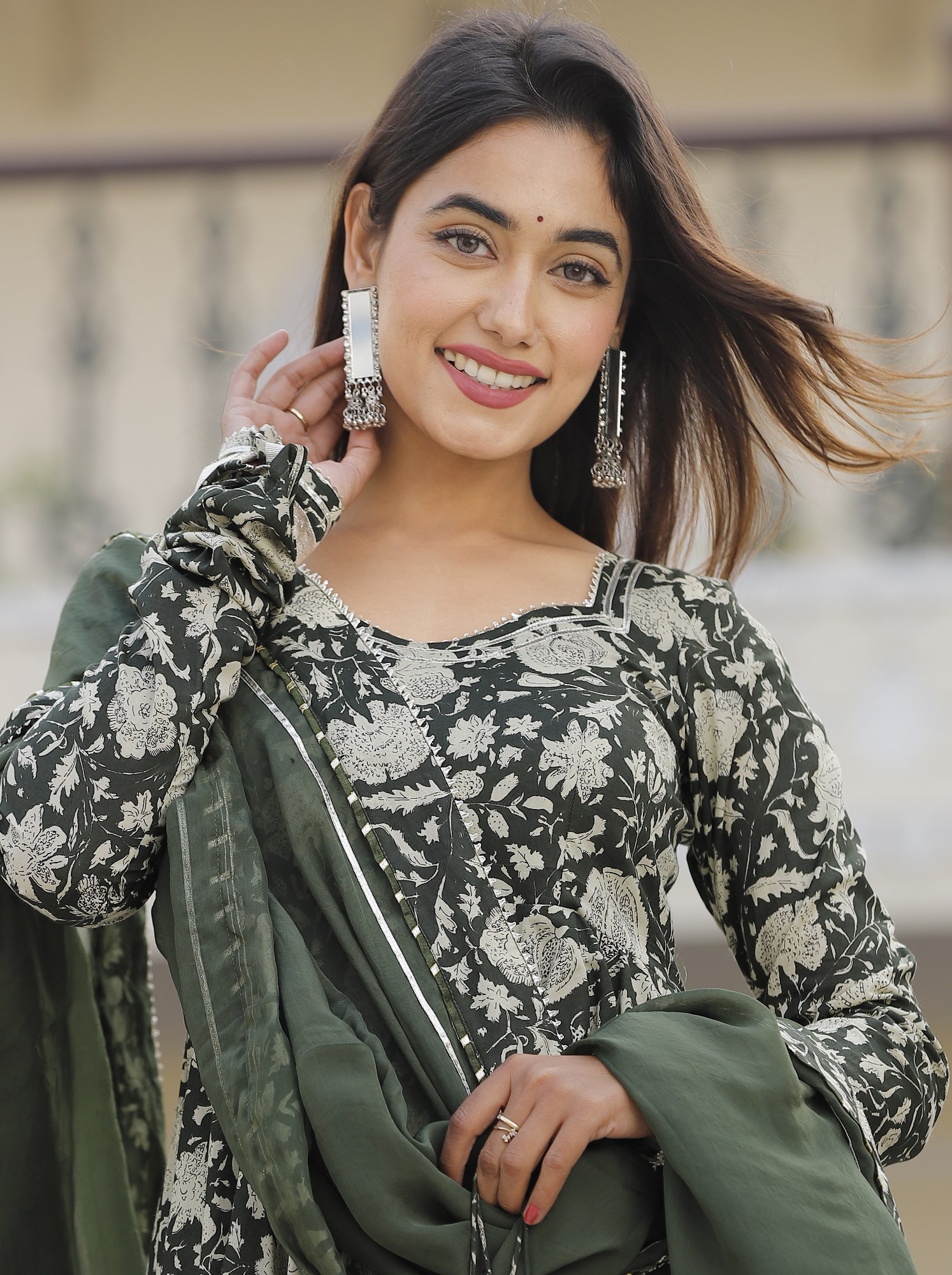 The screen print technique used to decorate this Anarkali set is a unique and contemporary touch that will set you apart from the crowd. The intricate designs and patterns are sure to turn heads and make you the center of attention. The set is available in all sizes, so you can find the perfect fit for your body shape. Whether you’re attending a wedding, a formal event, or simply looking for a stylish outfit for everyday wear, this Blue Green Anarkali Set is sure to make you look and feel your best. Don’t wait any longer and grab yours today!