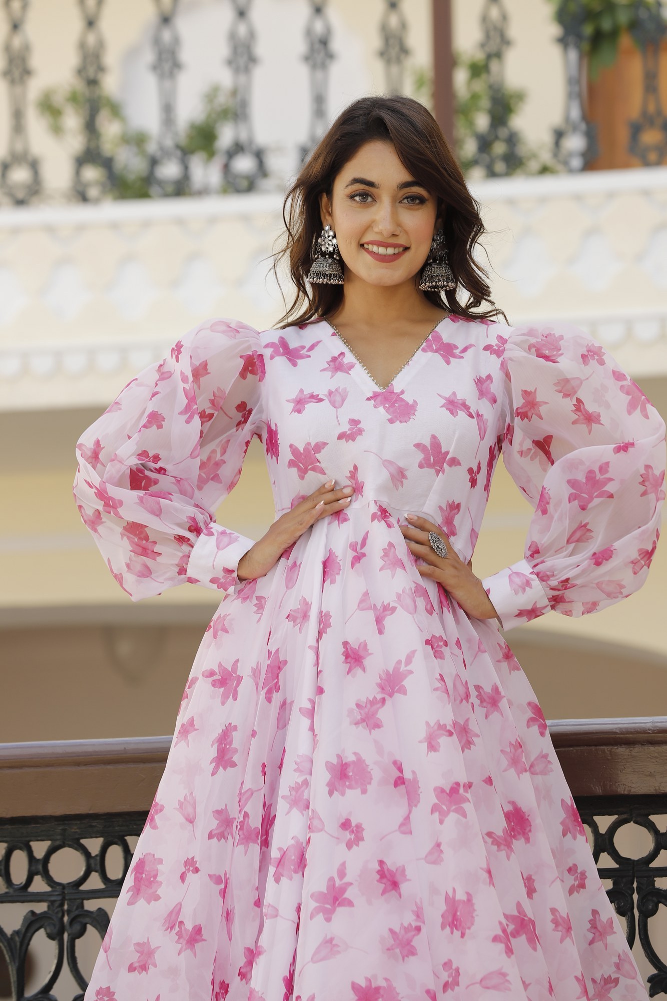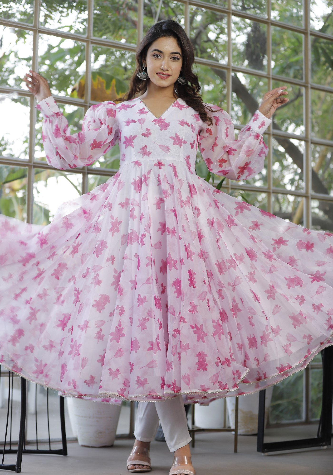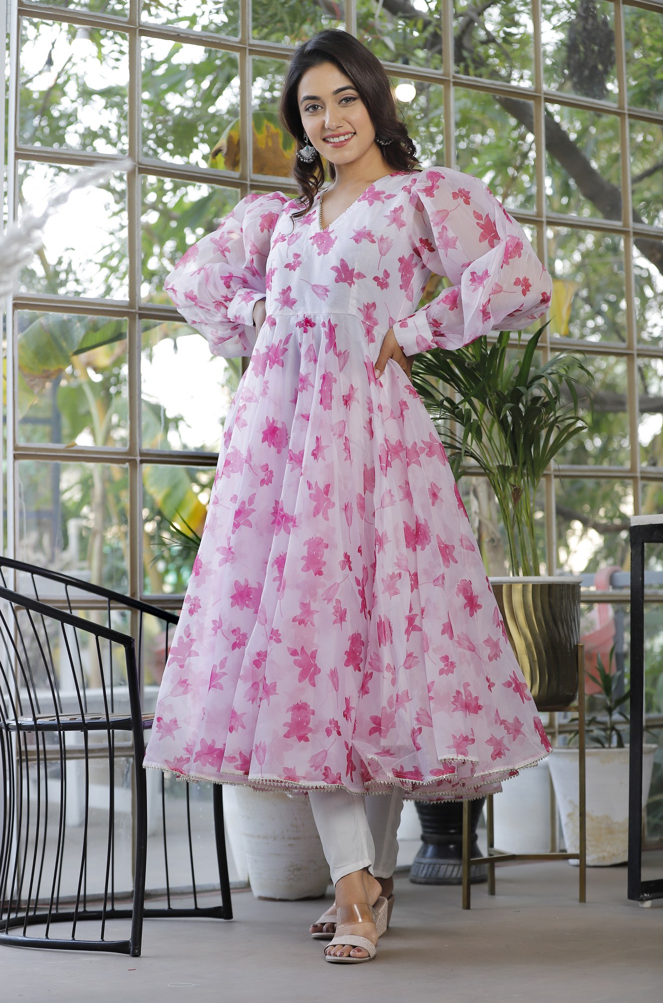 Introducing the stunning ‘Anarkali Suit Set’ featuring a meadow saffron flower print on a soft and flowy organza fabric. The Anarkali pattern and balloon sleeves add a touch of elegance, while the digital print technique ensures a high-quality finish that will last wash after wash. This suit set comes with a V-neckline that adds a hint of modernity to the traditional design making it perfect for any occasion. Feel the Traditional Comfort.