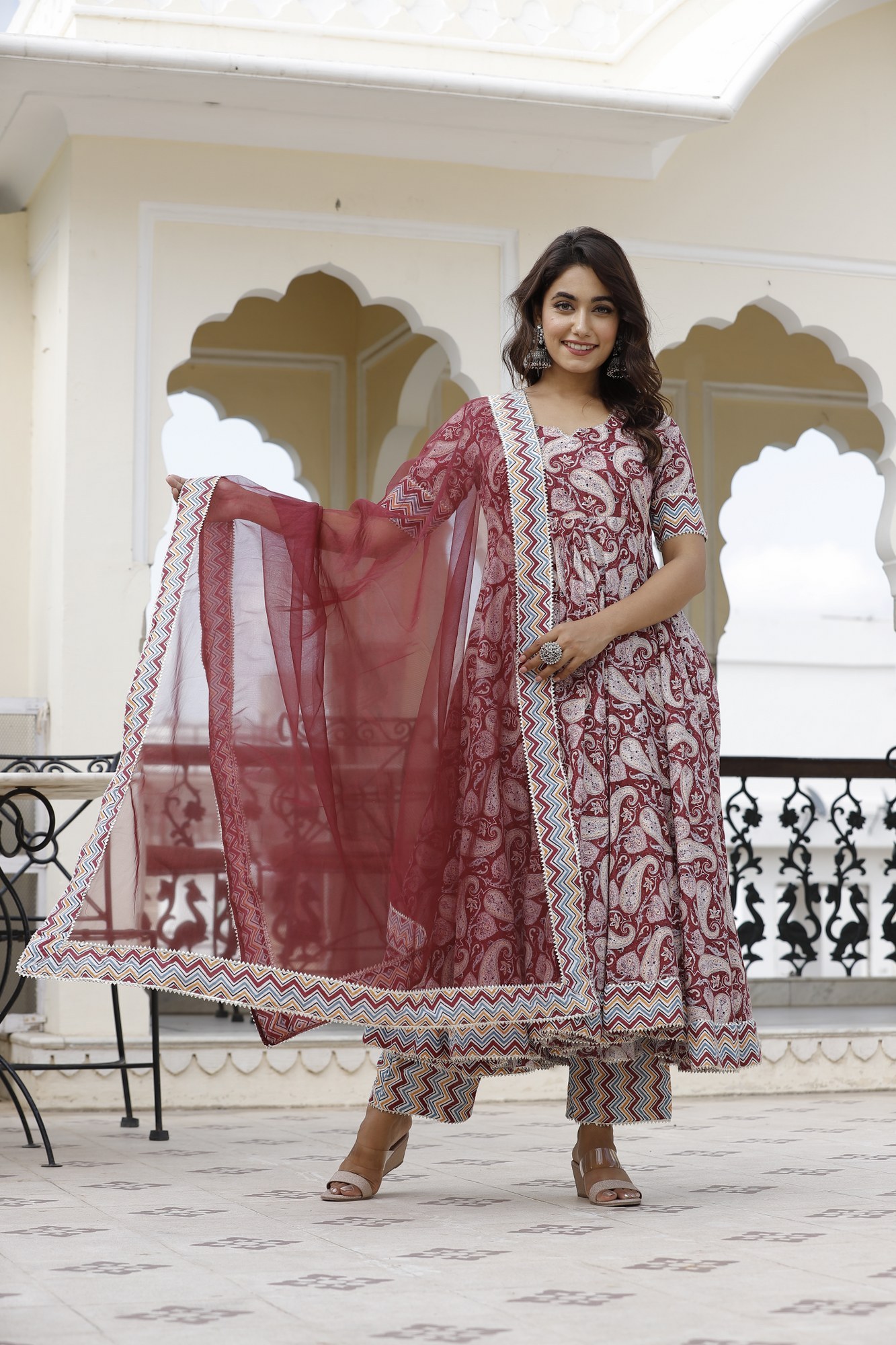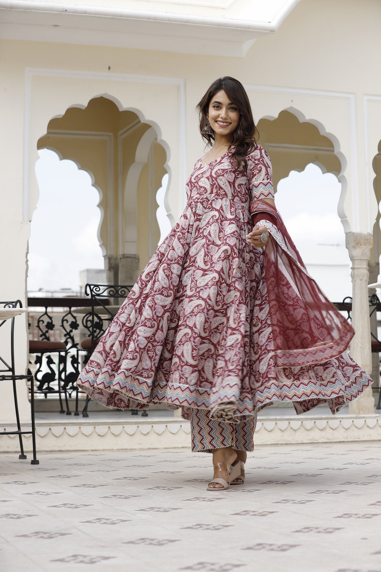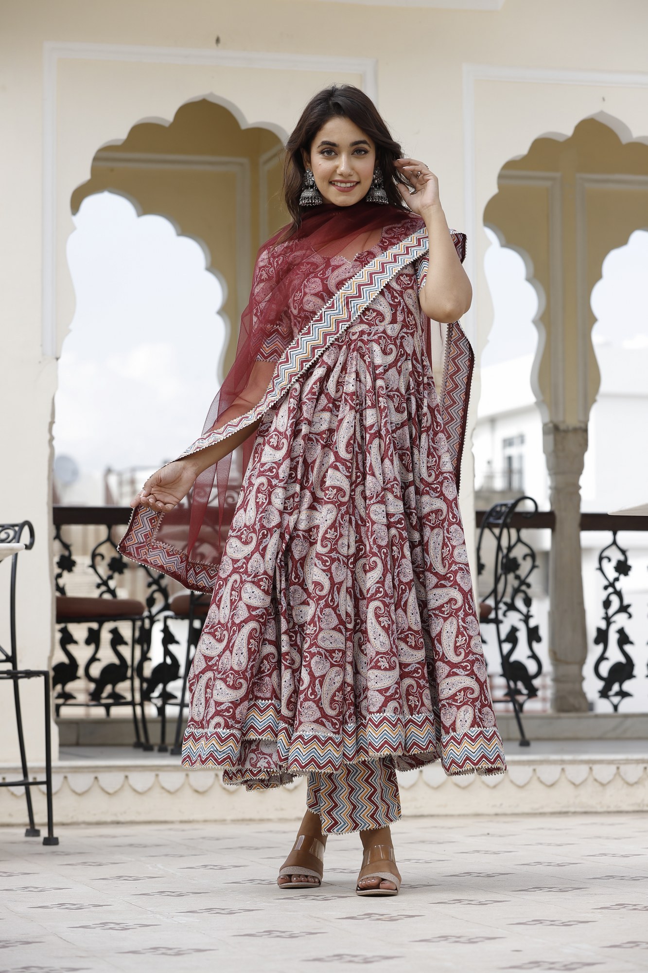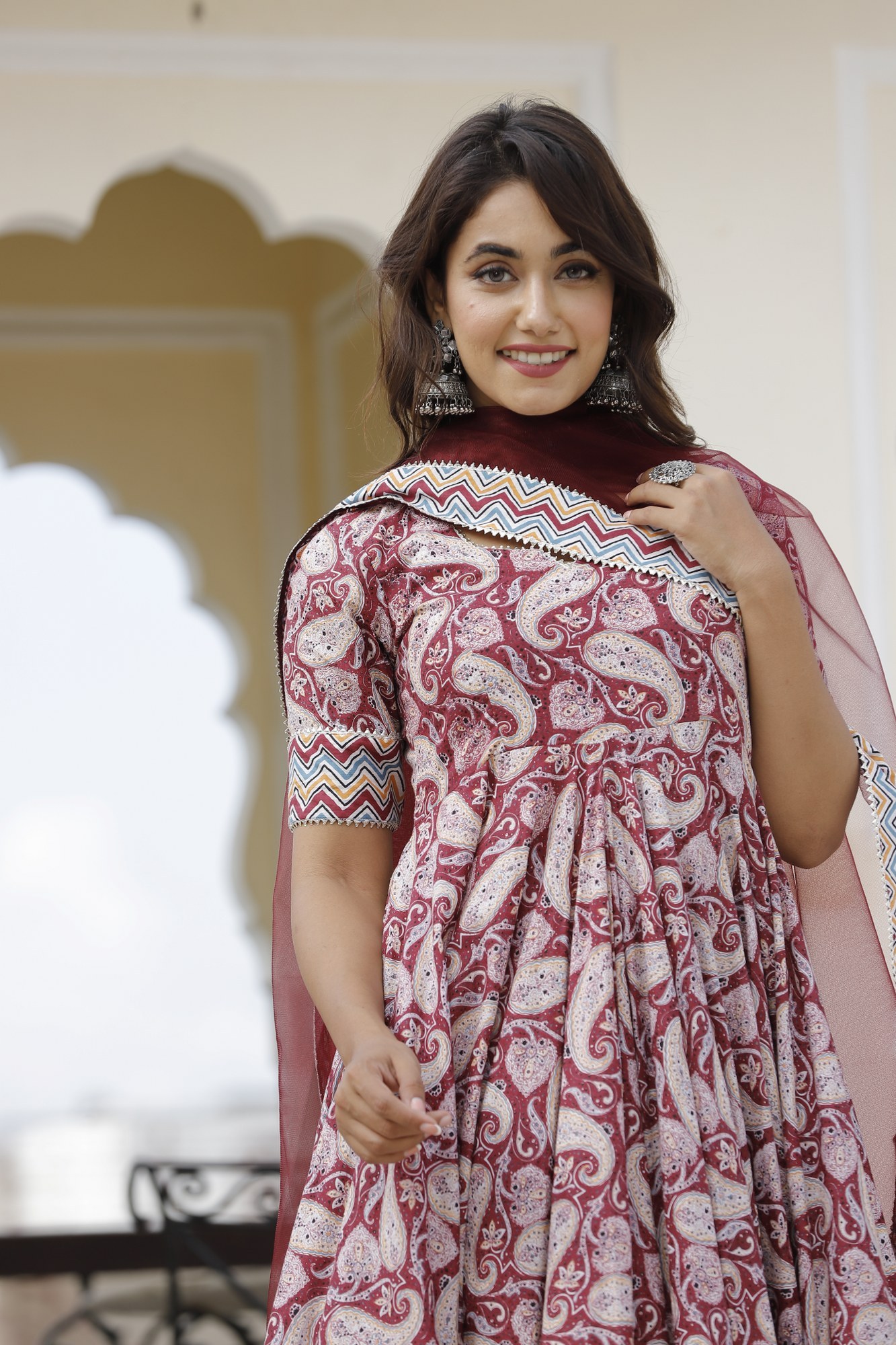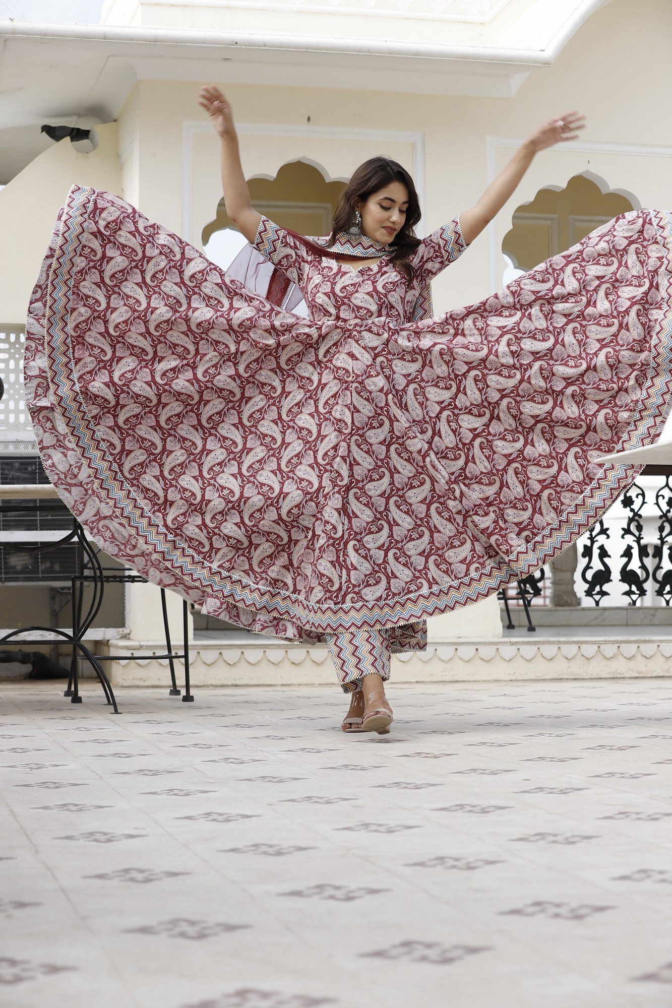 Introducing the stunning Paisley Printed Anarkali Set, crafted to make you feel both fashionable and comfortable. Made from high-quality cotton fabric, this Anarkali set is breathable, lightweight, and comfortable to wear, making it perfect for any event.