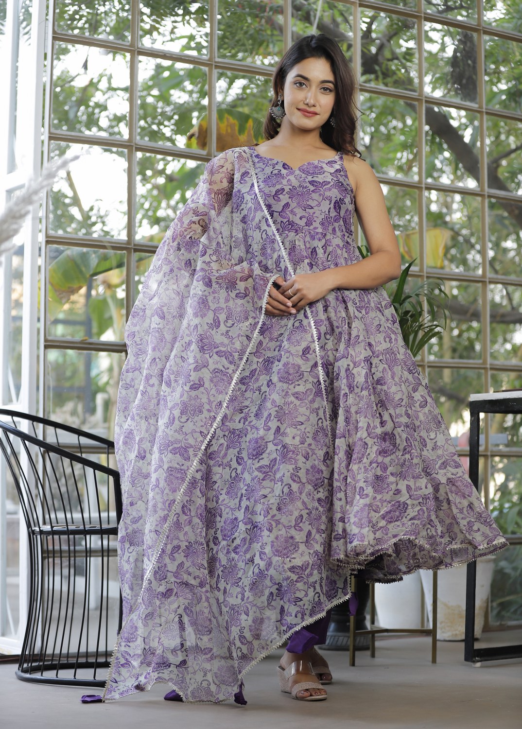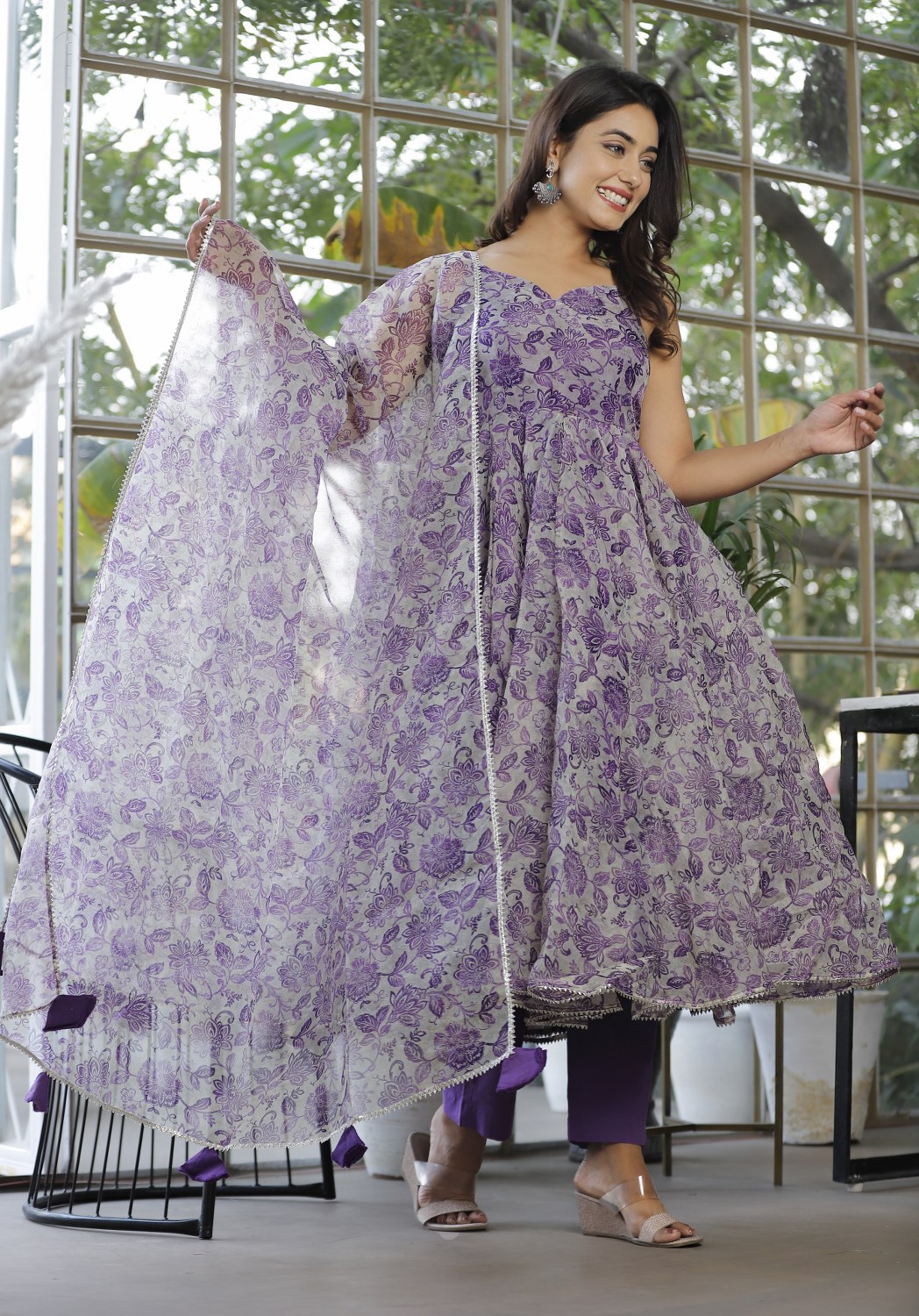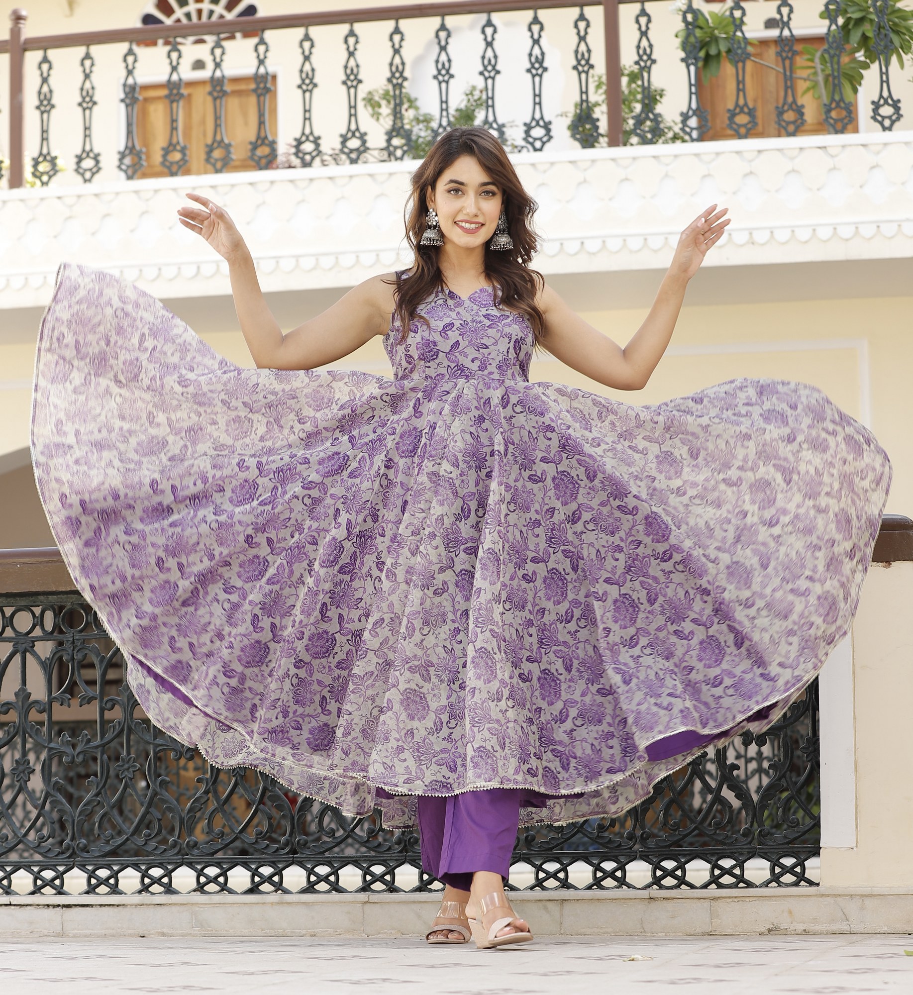 In summary, the Purple Flower Anarkali Set is a magnificent addition to any woman’s wardrobe. With its deep purple color, stunning digital print, and high-quality construction, this set is perfect for weddings, parties, or any special occasion where you want to make a statement. It’s a timeless piece that will never go out of style and can be worn for years to come. Don’t miss out on this perfect fusion of traditional and modern style, get your Purple Flower Anarkali Set today!