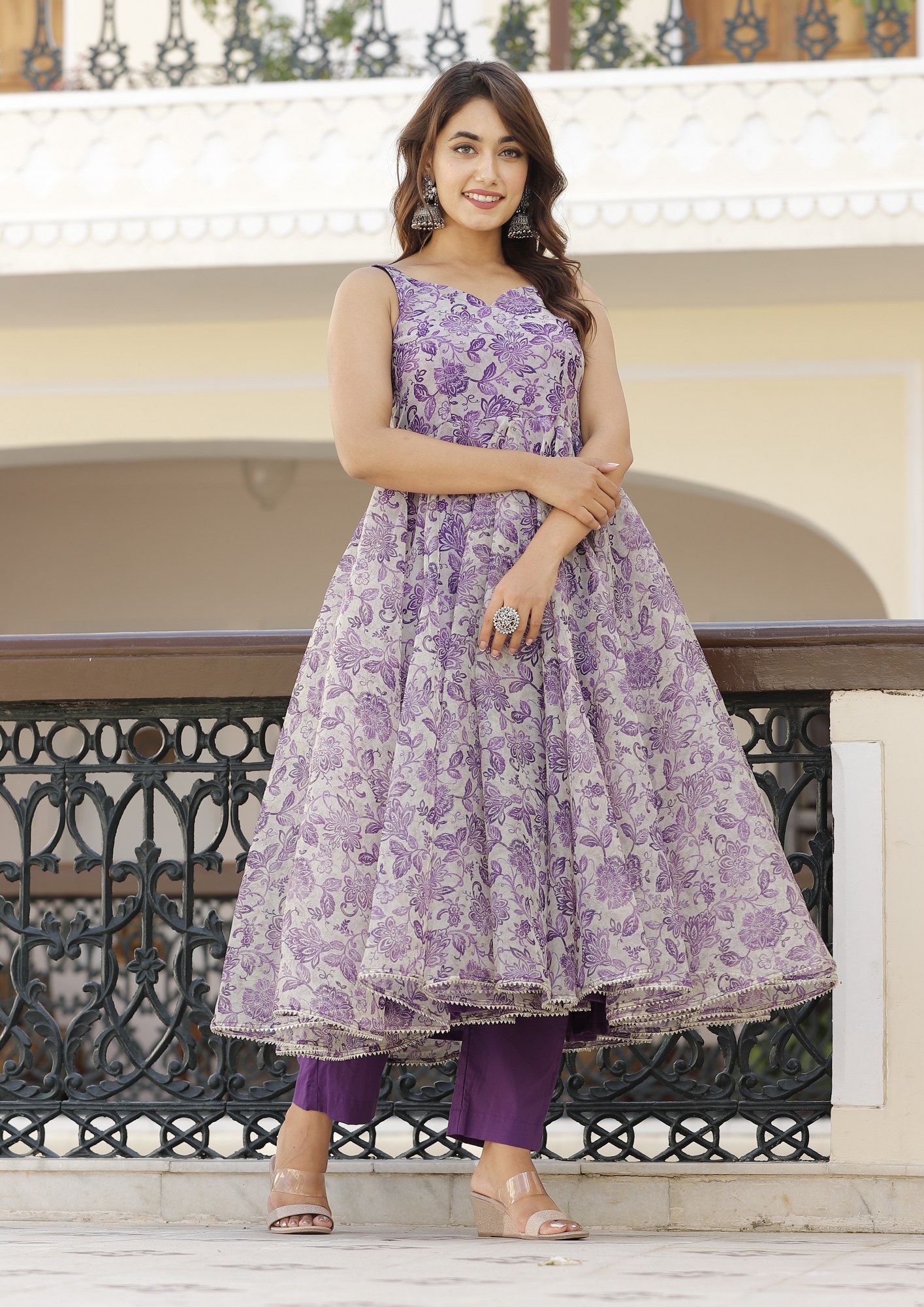 The neckline of the Purple Flower Anarkali Set features a sweetheart style, which adds a touch of elegance and femininity to the design. This neckline is perfect for showcasing your favorite jewelry, be it a pair of statement earrings or a beautiful necklace.
