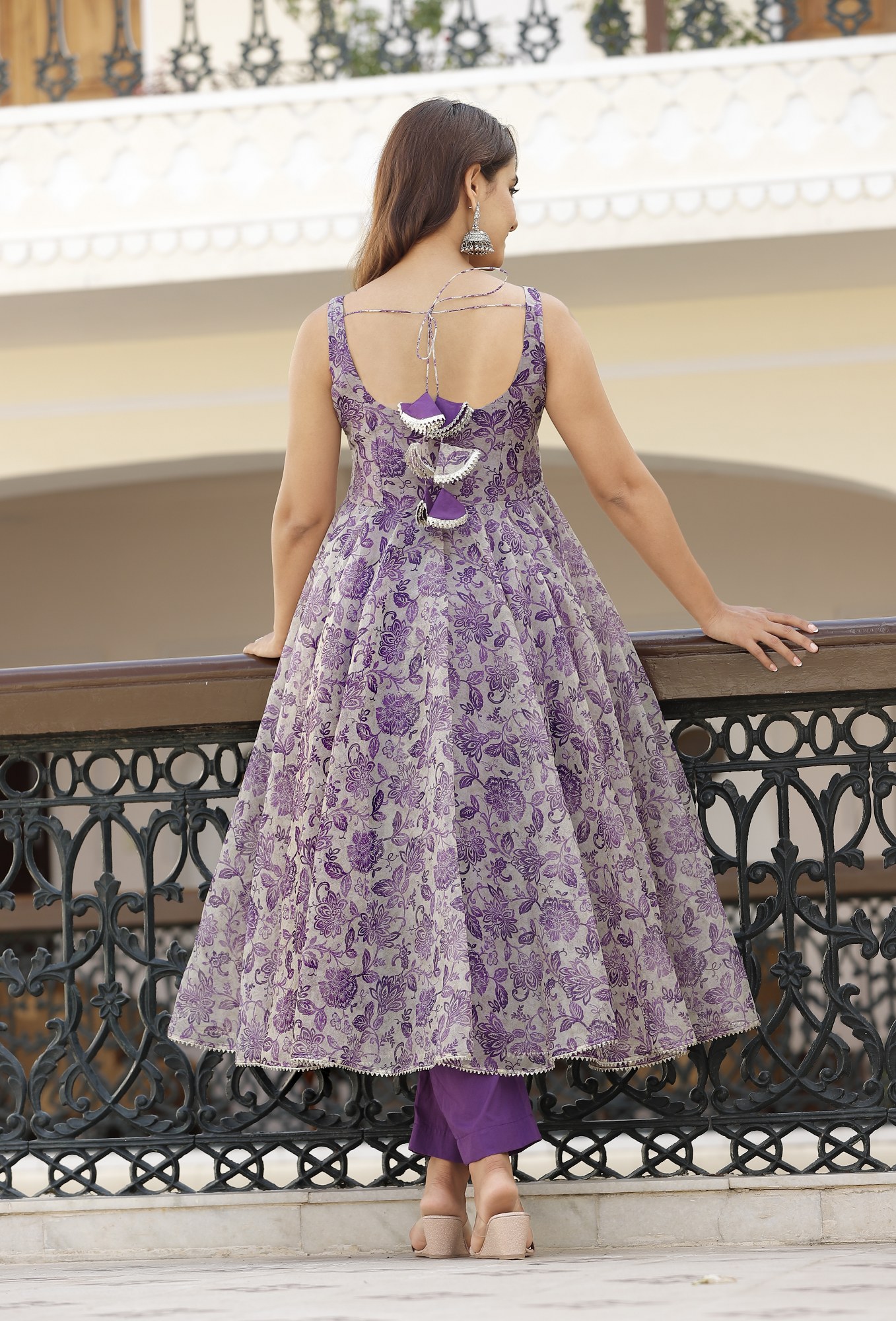 One of the most striking features of this Anarkali set is the stunning digital print of purple flowers that covers the entire fabric. The print is intricate and detailed, creating a bold and mesmerizing effect that’s sure to leave a lasting impression.