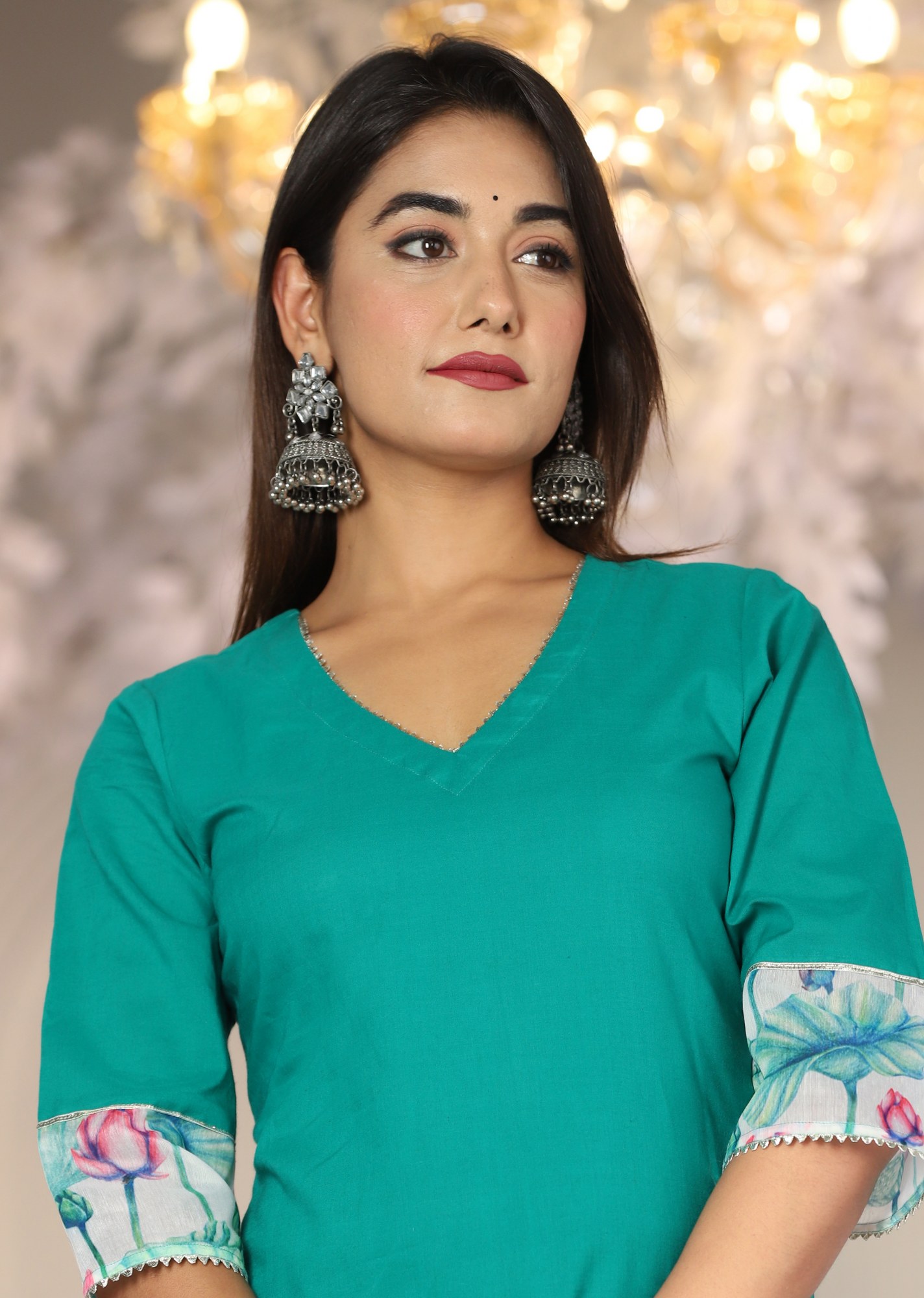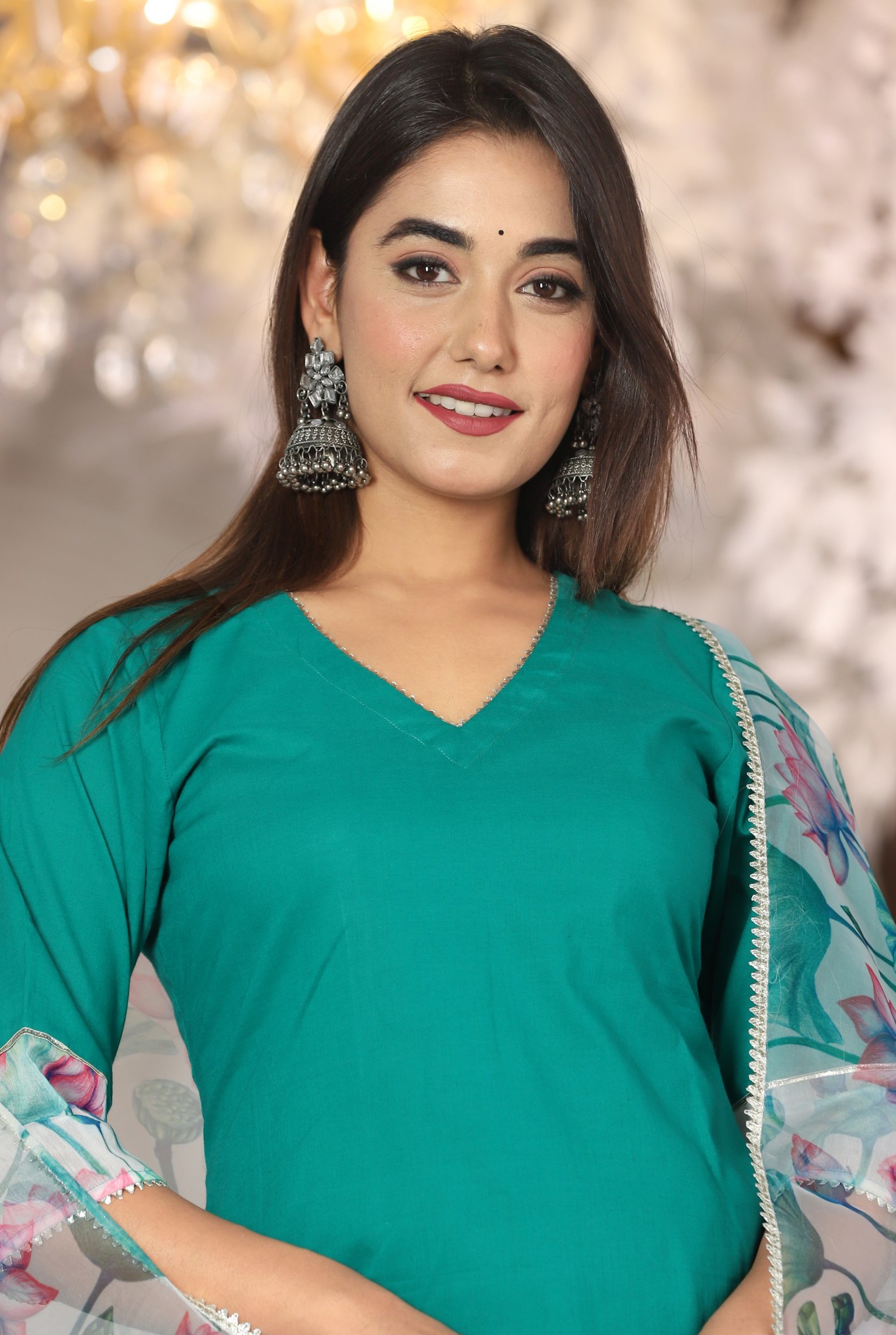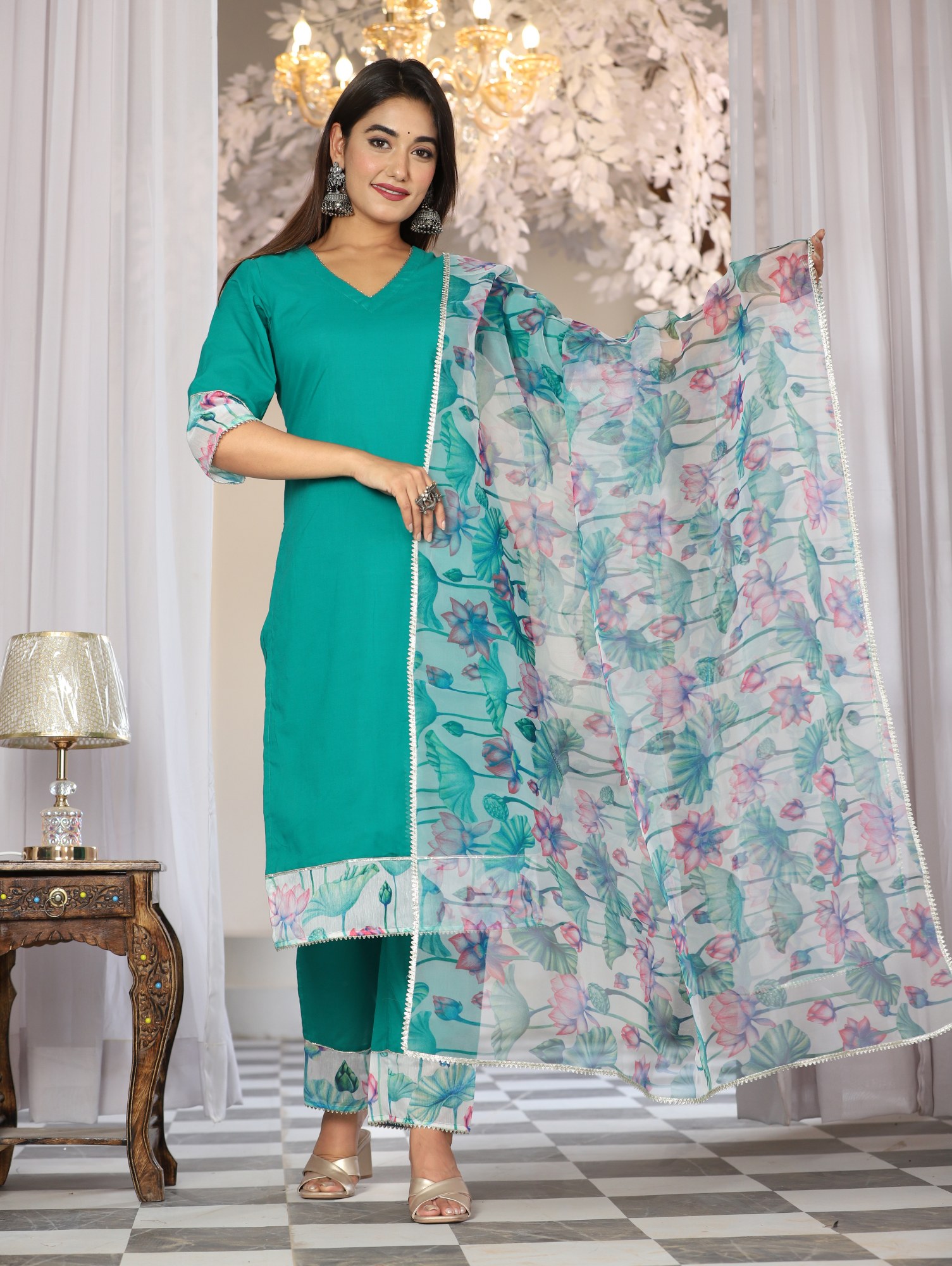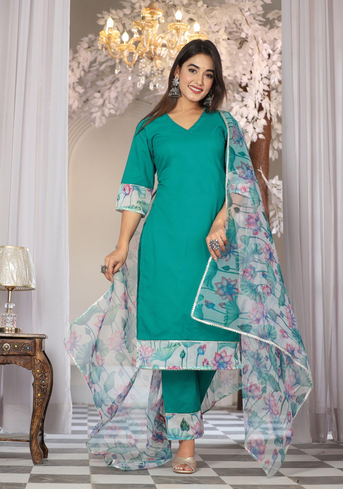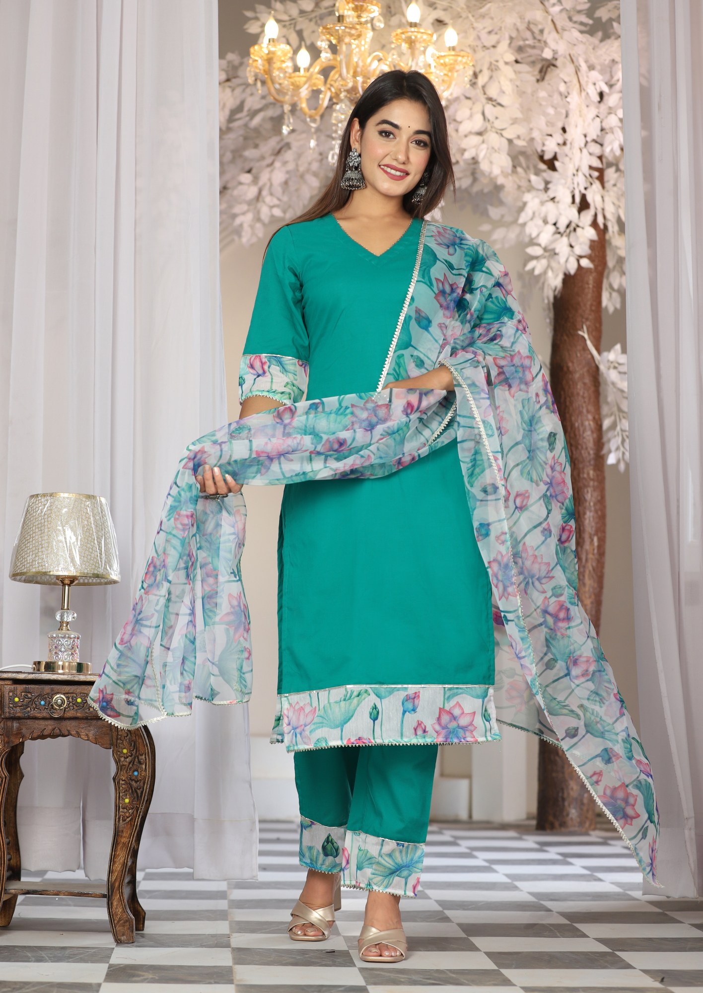 Teal Cotton Organza Suit Set