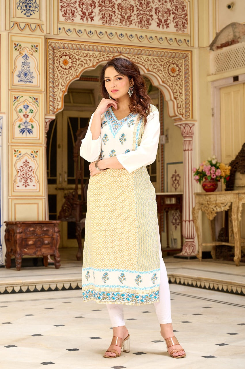 Elegant Off-White & Pastel Yellow Printed Kurta with Blue Embroidery by Vilai Jaipur